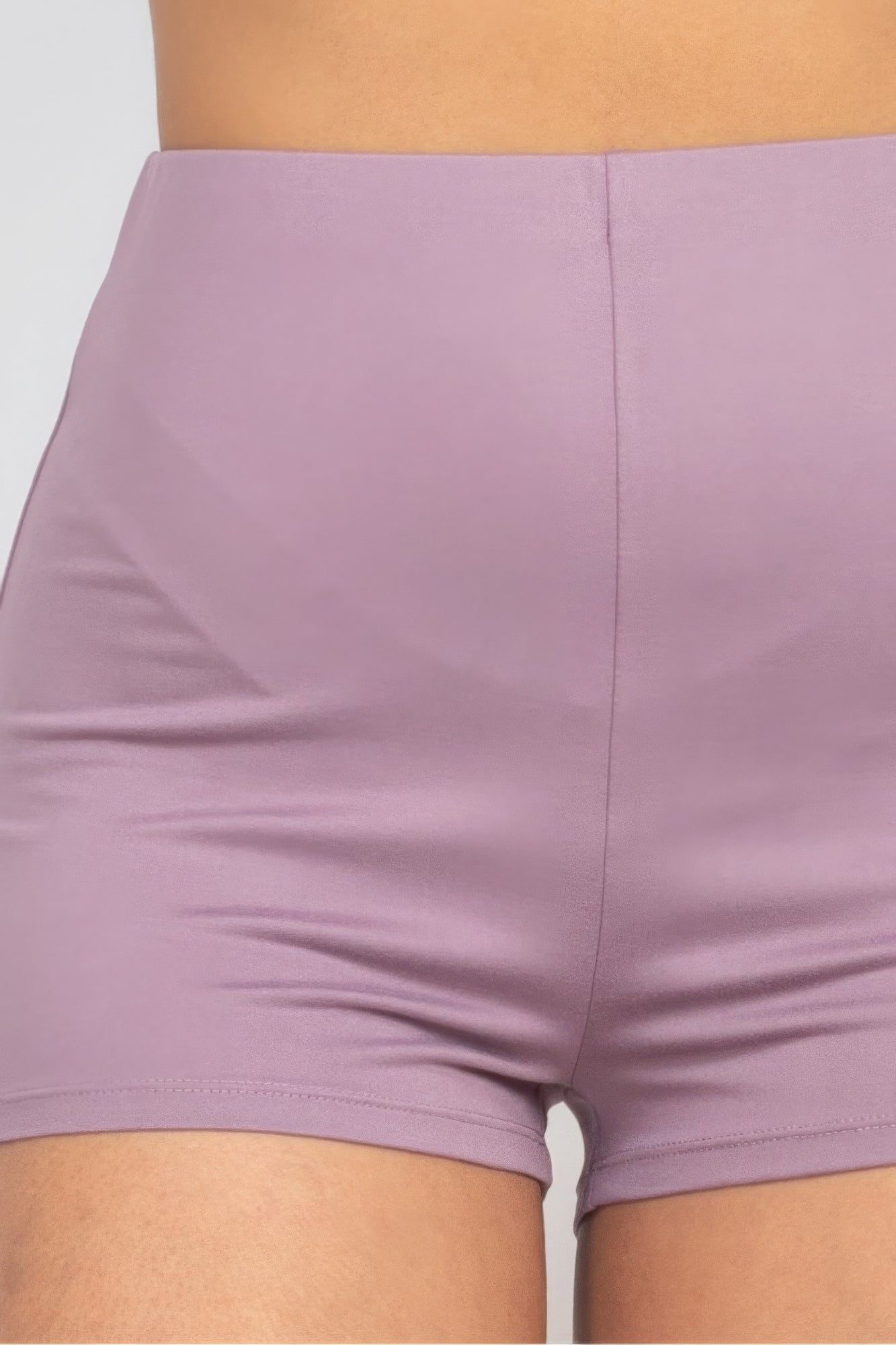 Casual shorts in a matching solid color with a high-rise waist and elasticized waistband for a comfortable fit. The mini length adds a playful vibe, making them perfect for casual outings or lounging at home.