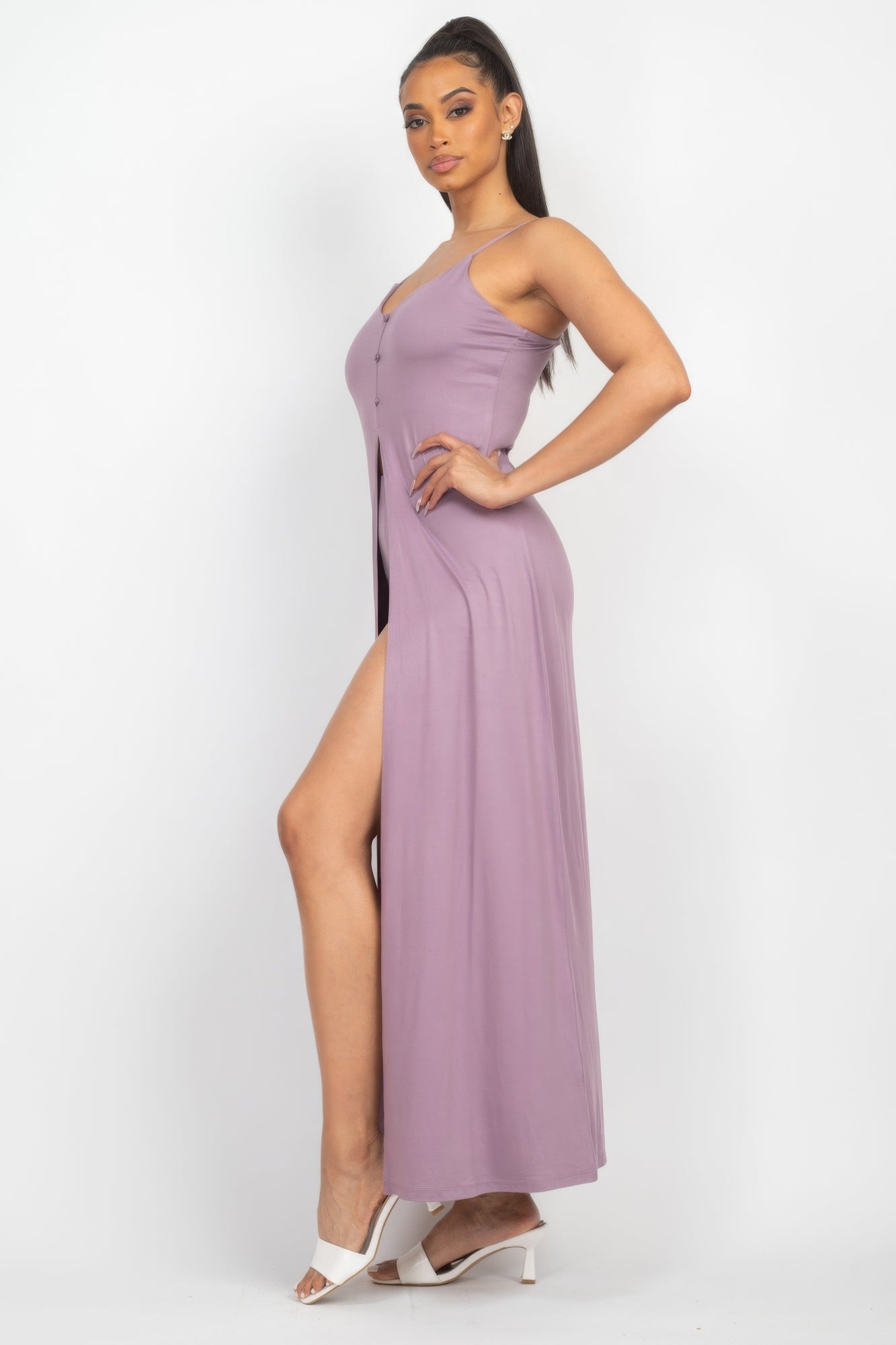 A casual top in a solid color with a scoop neckline, adjustable cami straps, and a sleeveless cut for breezy comfort. The front slit detail and button-down closure add a touch of flair, creating a full-length silhouette that's effortlessly chic.